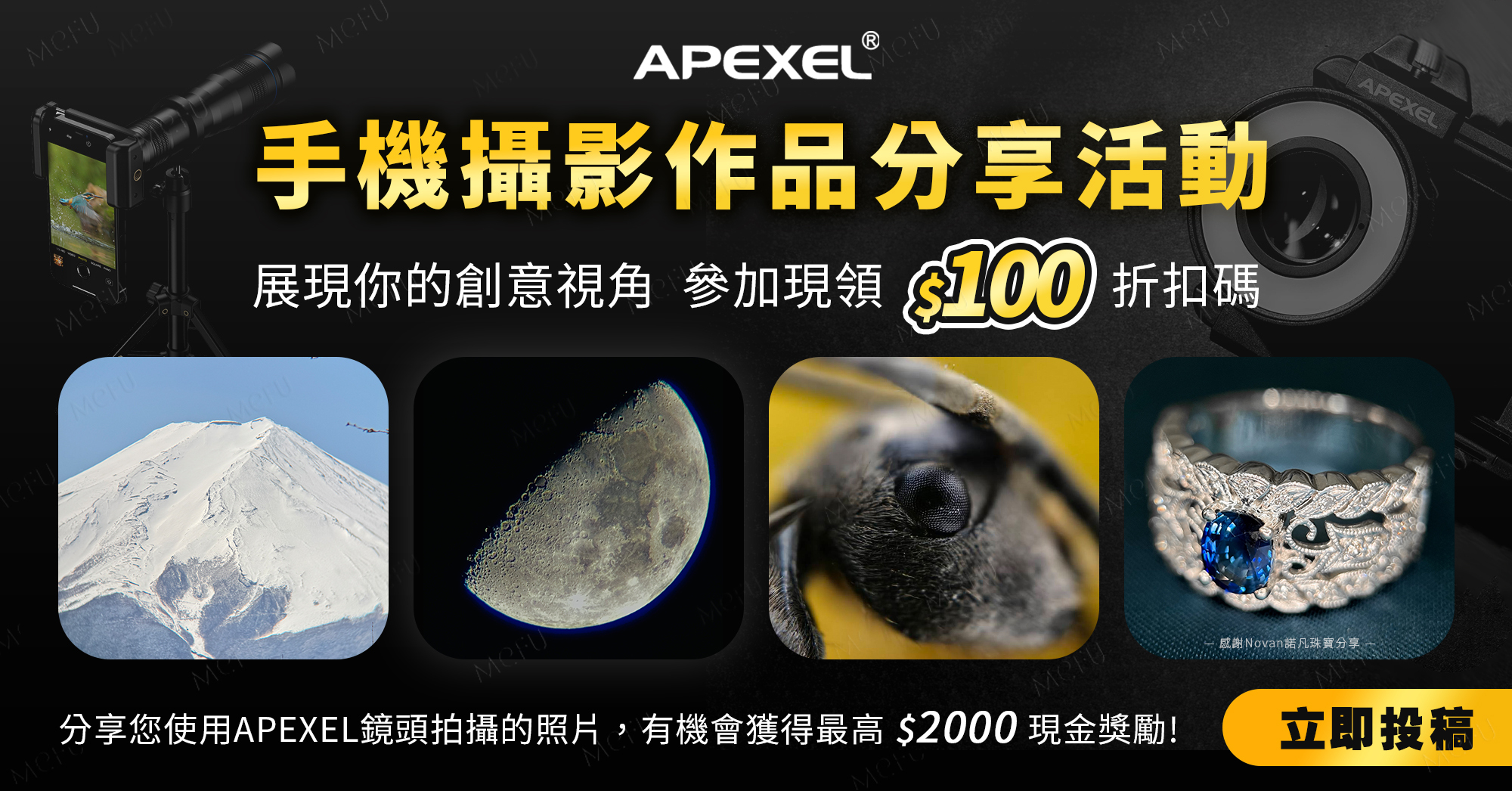 APEXEL 致力於推動攝影愛好者和創意人士的創新與表現,為了讓更多人發現攝影的無限可能,特別舉辦了「APEXEL 創意作品分享活動」。透過這次活動,我們期望參與者能夠分享他們使用 APEXEL 鏡頭拍攝的作品,展示其創意和技術,並有機會獲得現金獎勵,進一步激發攝影創作的熱情與動力。