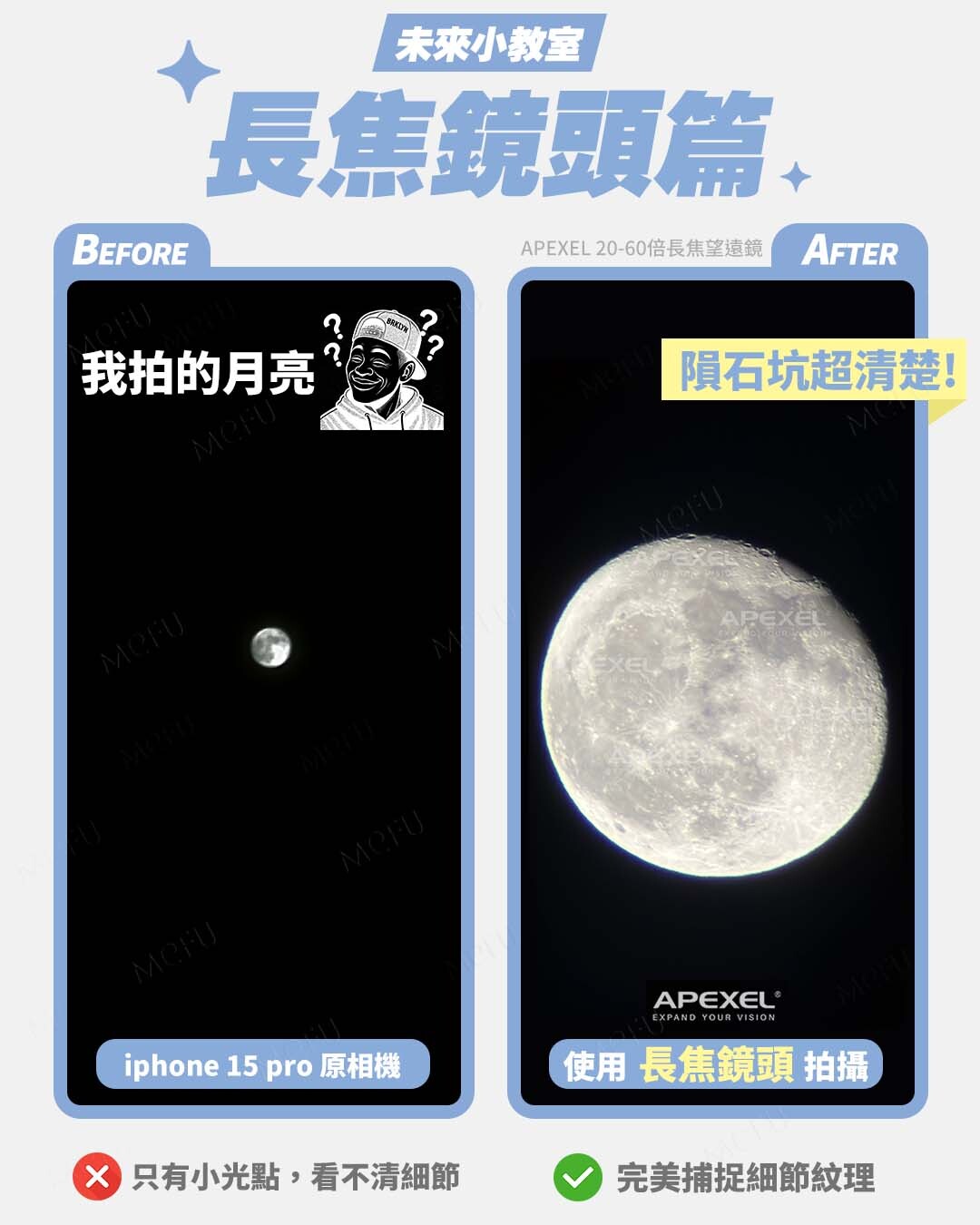 🔭右圖:搭配 APEXEL 長焦鏡頭 → 清楚捕捉月亮表面的隕石坑,細節震撼超清晰✔️