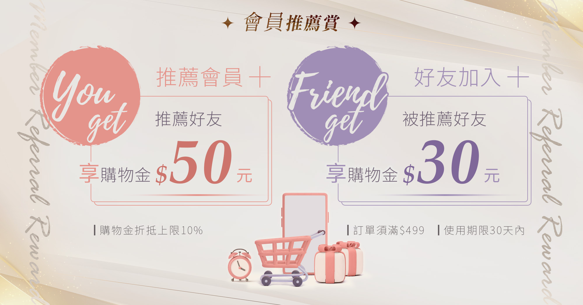 →好友點擊連結後加入會員(獲得$30購物金)→好友下單且訂單「已完成」,您即可再獲得$50購物金。
