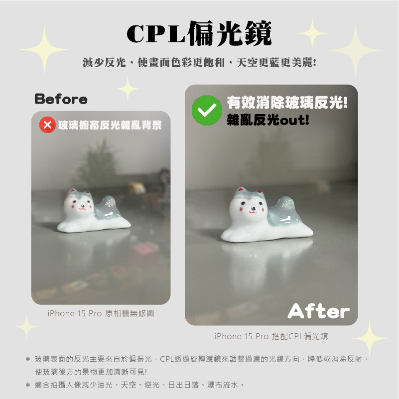 ❤️CPL偏光鏡:減少反光、減少色差、保留細節的效果,消除非金屬表面無用 的反光,減少水波紋/讓天空更藍 。