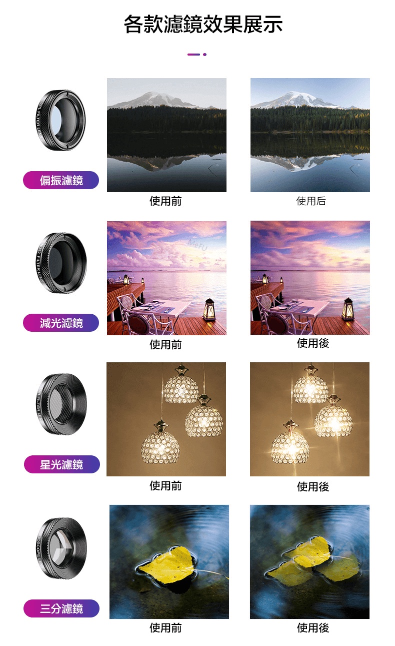 有機玻璃:ND32/偏光鏡/星光鏡/三分鏡/漸變鏡/全色濾鏡