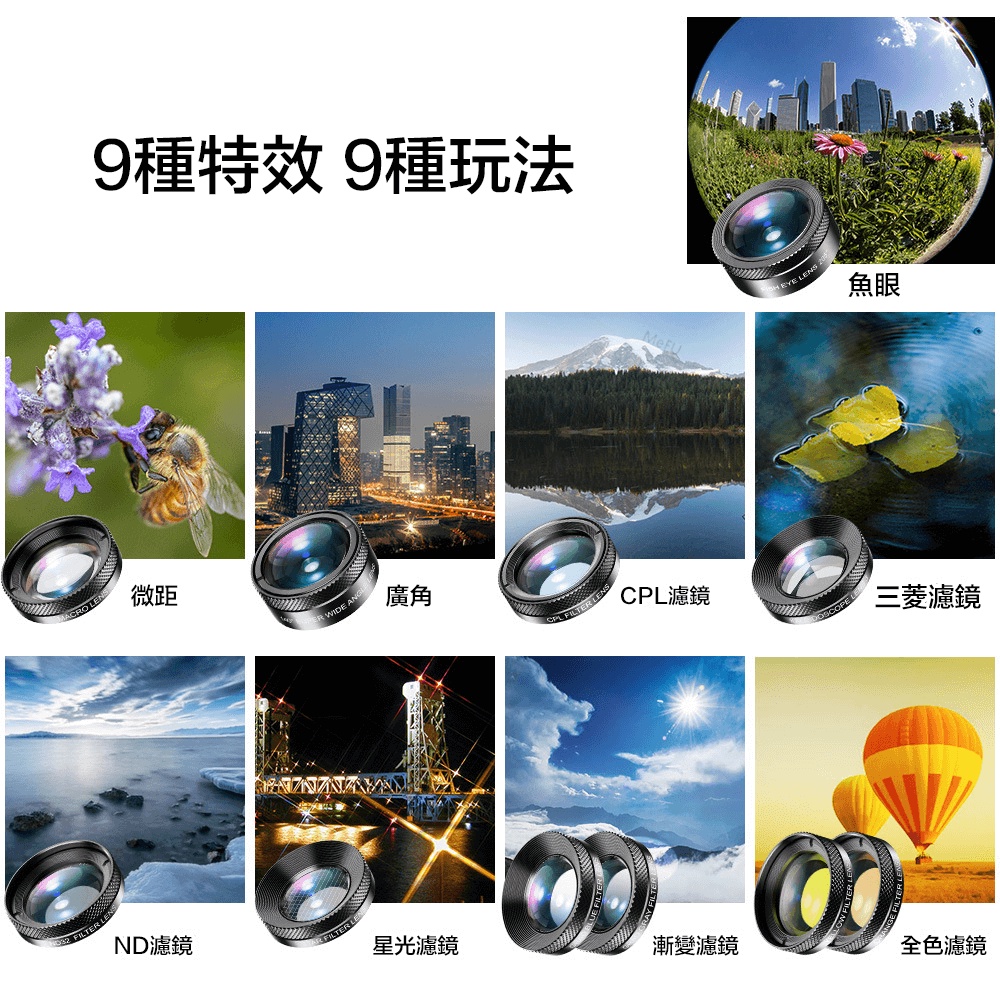 產品內容:鏡頭*11、收納袋、擦拭布、說明書、專用夾
