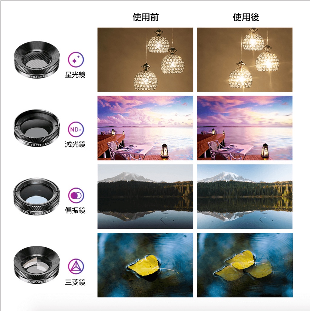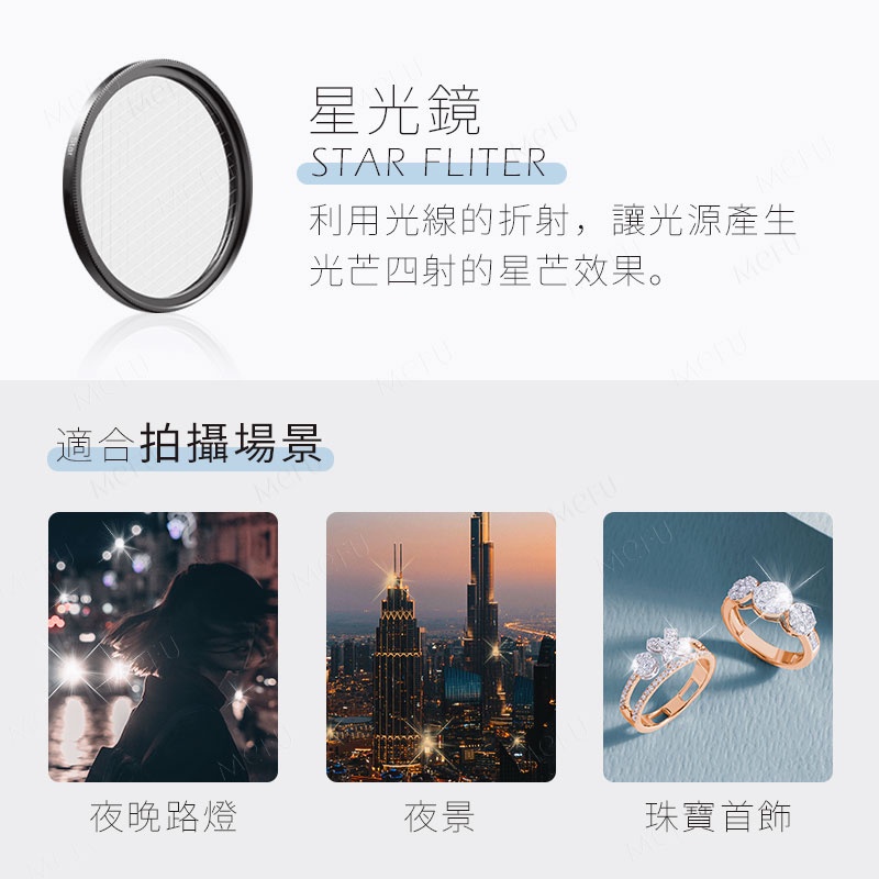 利用光線的折射,讓光源產生光芒四射的星芒效果。適合拍攝場景:夜晚路燈、夜景、珠寶首飾。