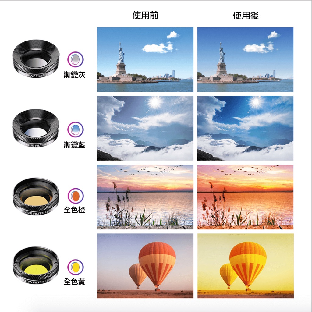 【全橙濾鏡】:全色橙用於拍攝日出日落場景,重現更豐富的彩色。