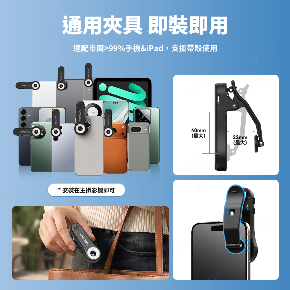 A: 99%手機都可以使用,安裝在主鏡頭上就可以了,若不知道自己主鏡頭是哪一顆,可以開啟相機用手指遮蔽看看,可以完全將畫面蓋住的,就是手機的主鏡頭^_^