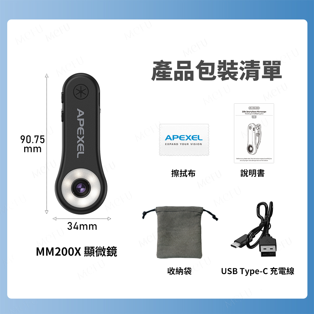 包裝內容物:200x顯微鏡、布質收納袋、usb Type-c充電線、擦拭布、說明書