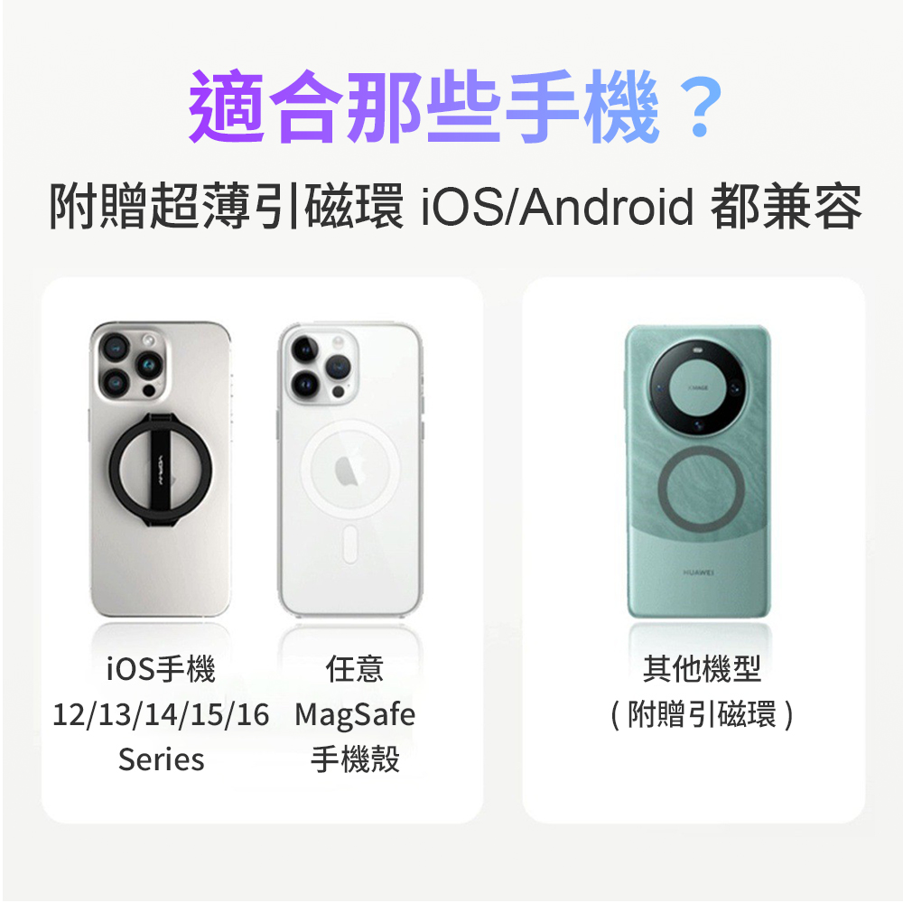 適配手機: iphone12以上機型、帶有Magsafe功能手機殼;其他機型可搭配引磁環使用。