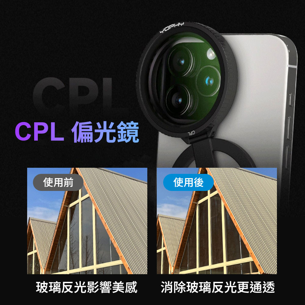 【高清CPL偏光鏡】:減少水面、玻璃等表面反射,提升色彩飽和度和對比度。 • 應用情境: 適用於風景、城市景觀及拍攝藍天。
