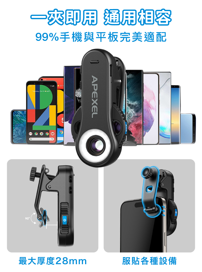 採用 通用型夾式設計,適用市面上大多數智慧型手機與平板。
