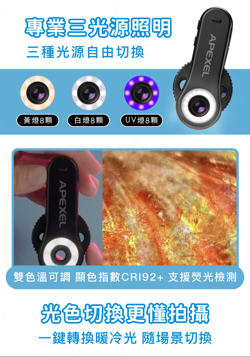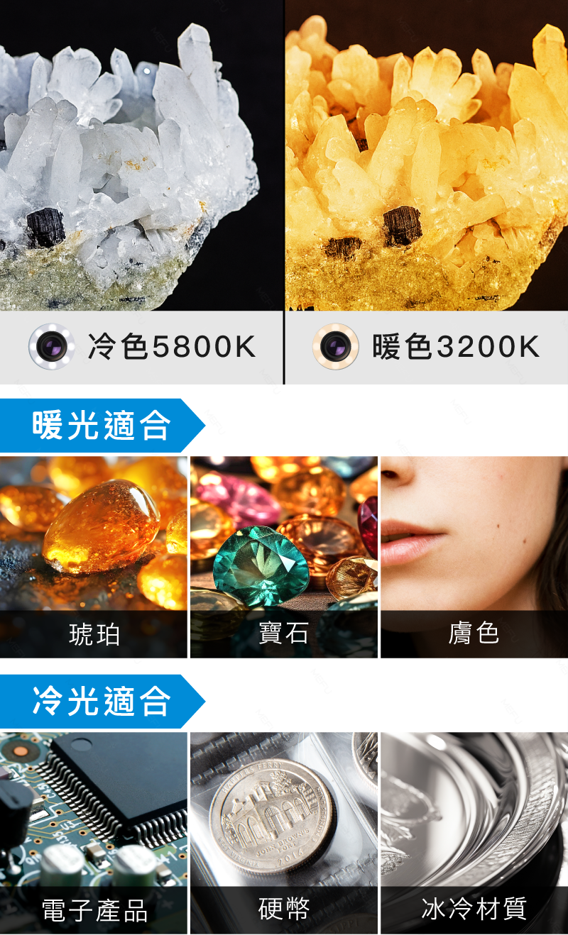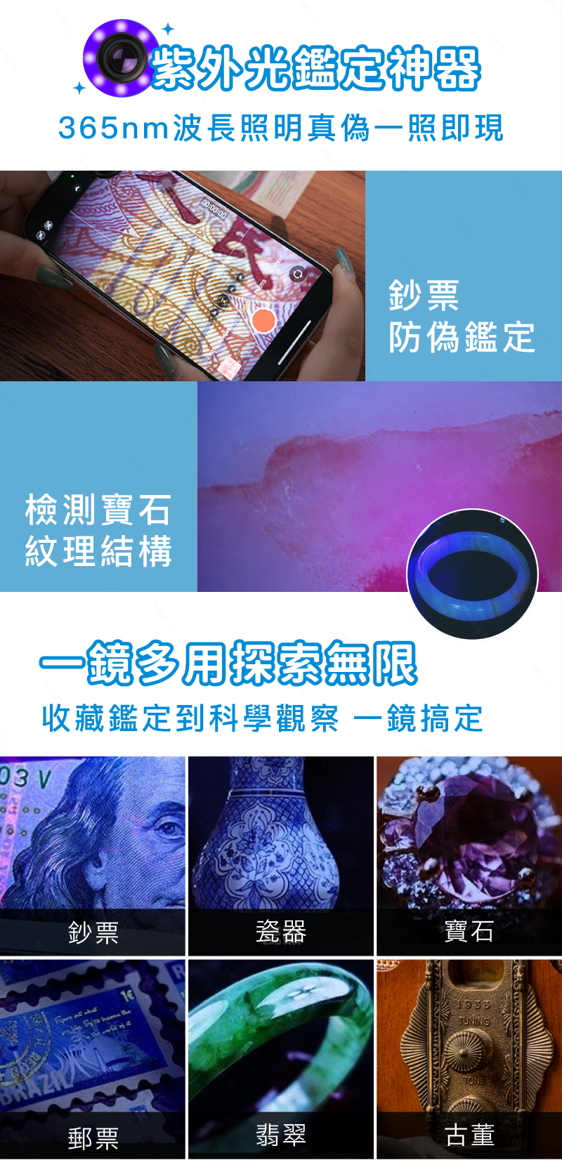 UV 模式:用於辨識螢光反應、真偽鑑定、礦石與寶石觀察等特殊需求