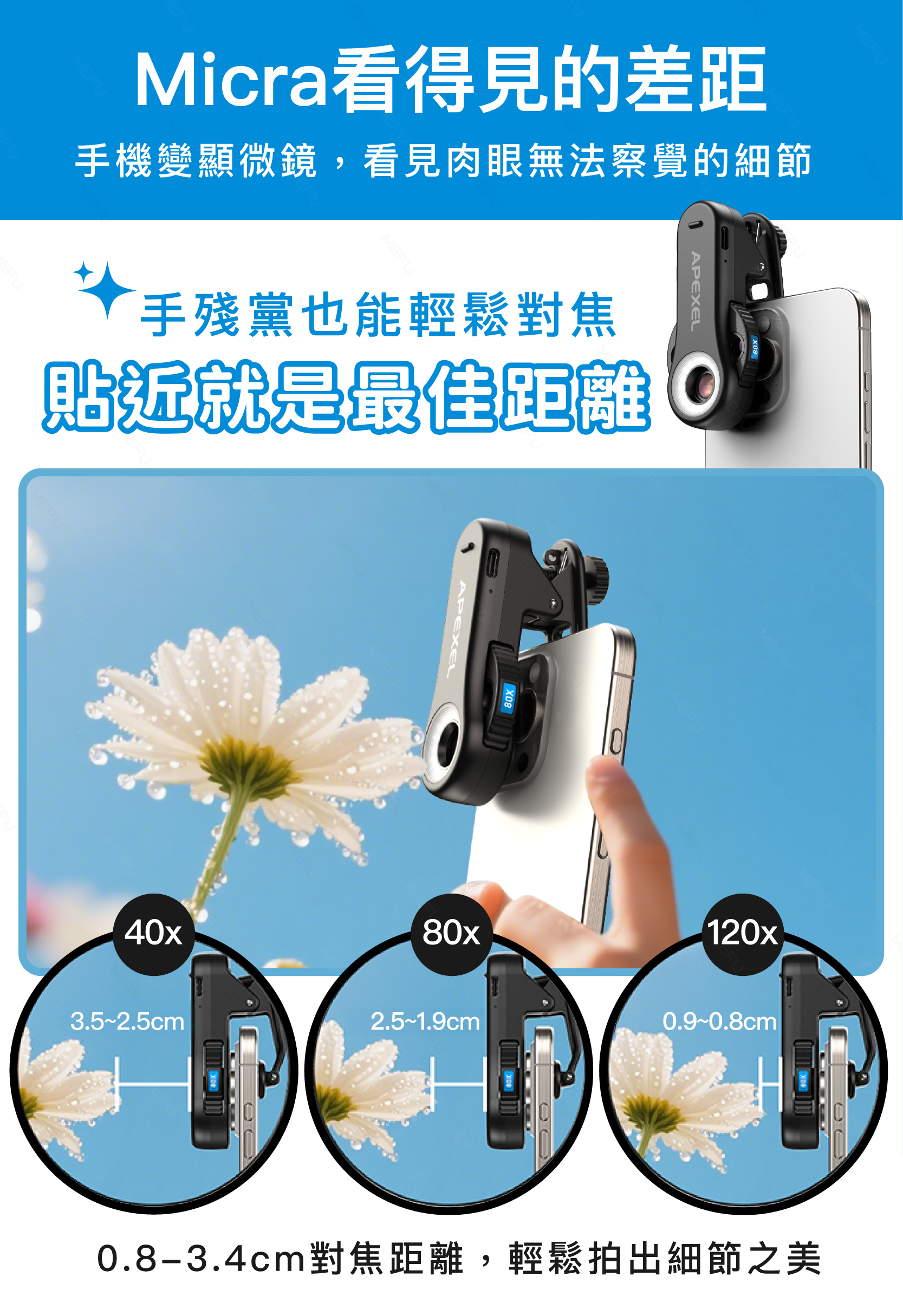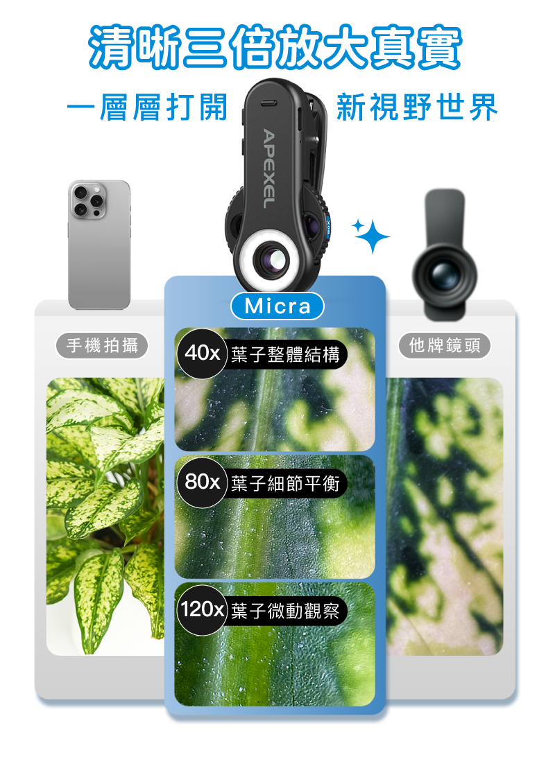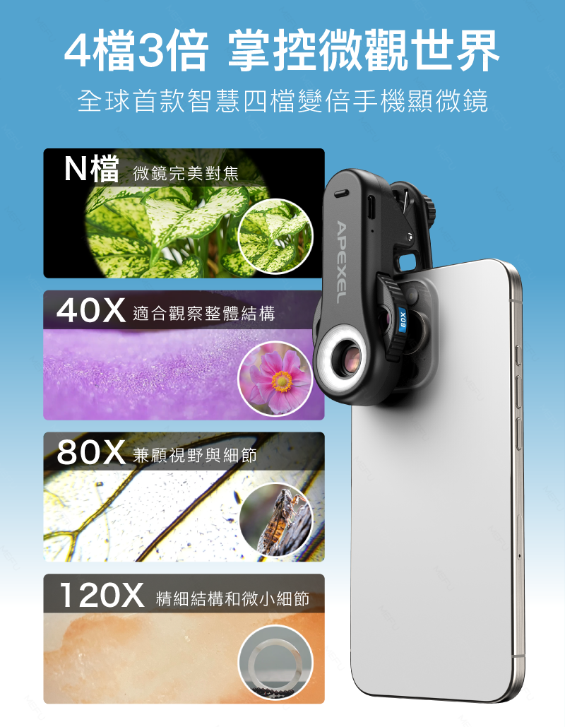✨ 首創三檔轉輪設計|40X / 80X / 120X 一旋即換,免拆裝鏡頭