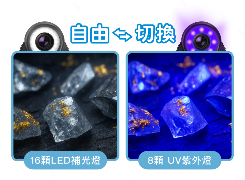✨ 專業三光源系統|16顆雙色補光+8顆UV紫燈,支援螢光檢測